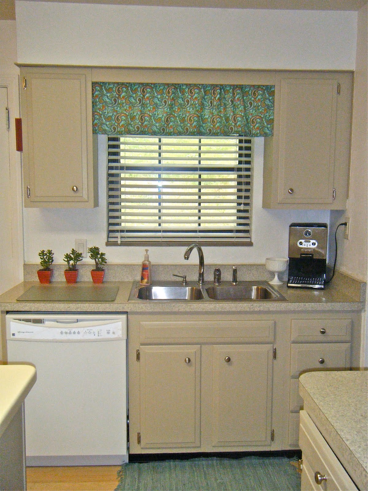 Like I've said before, I love and am very thankful for my house. However, it is still the epitome of a first home. We don't plan on being in this house more than a few years so we are trying to think of it as an investment and not put more into it than we think we are going to get out of it. Everyone knows that the money of a house is in its kitchen. That, my friend, is why we got such a good deal on this place. Its kitchen was like walking into a green hole. Green disgusting hole. I'm not kidding when I say that there was four inch hunter green plastic tile that went five feet up each wall of the kitchen. It literally took days of scraping and prying to get those mothers off. My point is, to say the kitchen needed a facelift would be an understatement, and we're not in the place to put new flooring, countertops, and cabinets in at this time. We made a lot of changes when we moved in but it was so plain. While working on the dining room, I got a little carried away and moved my motivation for pretty into the kitchen. Though hardly a gourmet kitchen, my favorite room of the house is now functional and much easier on the eyes. This will do just fine for now. It's called home improvement anyway, not home perfection. Right? Here's some before and after shots.